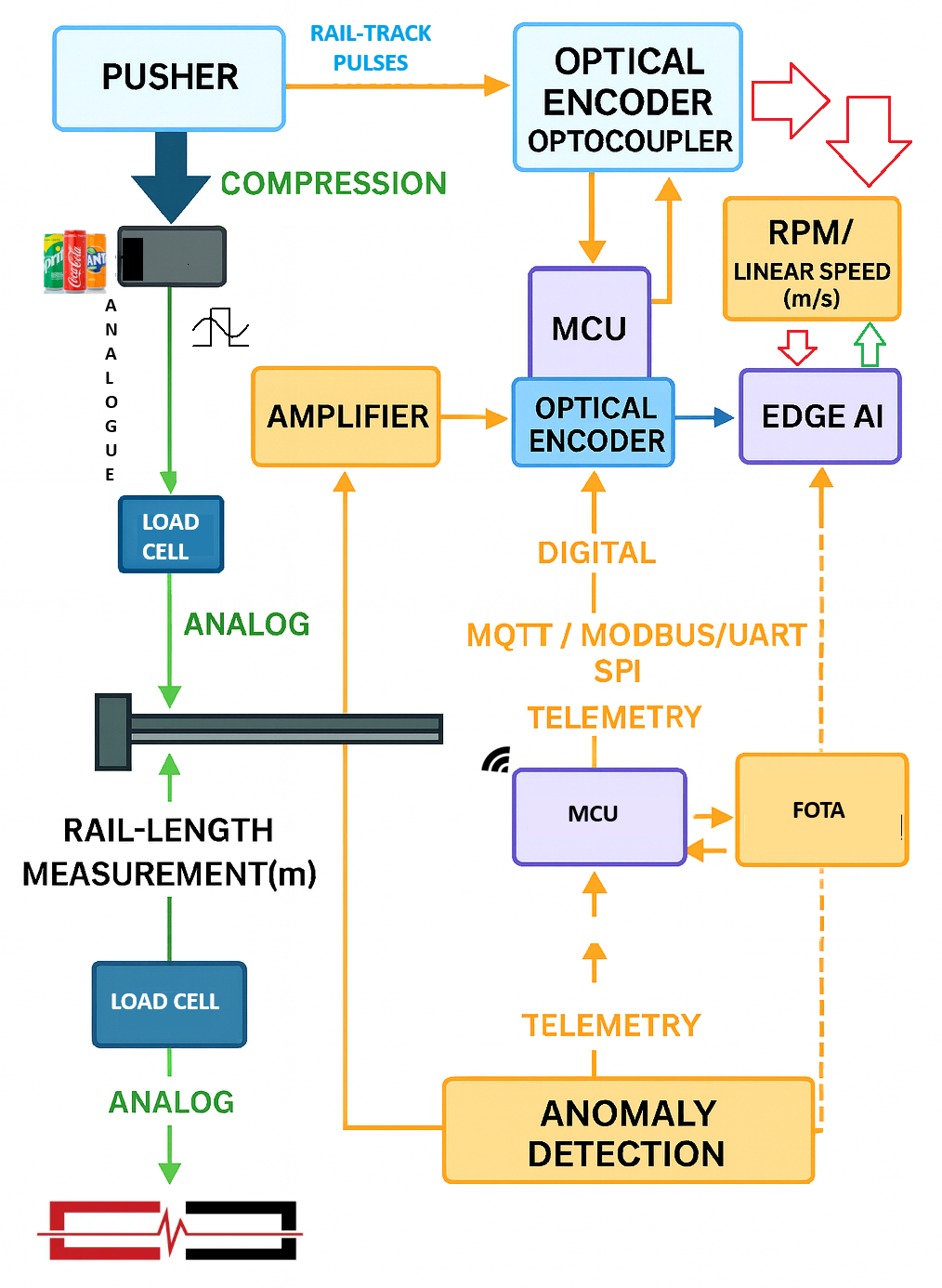 The Pusher Load-Cell System integrates mechanical force sensing, optical motion tracking, digital signal processing, and edge-level intelligence into a unified measurement and analytics platform. When the pusher applies compression to the target object, the resulting force is transmitted to the load cell, which outputs an analog signal proportional to displacement and pressure. This analog signal passes through the amplifier and is conditioned for accurate measurement before being forwarded to the MCU. In parallel, an optical encoder with optocoupler isolation captures rail movement, linear displacement, or product-count pulses, sending a clean digital signal directly into the MCU. The MCU fuses analog load-cell data with the encoder’s optical motion data and forwards the combined telemetry via MQTT/SPI to the Edge AI module. Edge AI performs high-resolution inference, calculates RPM/linear speed, and executes Anomaly Detection models to identify deviations in force curves, movement signatures, or mechanical behavior. The cleaned and enriched telemetry also returns feedback to the pusher subsystem for closed-loop real-time control. Pusher → Load Cell → Amplifier → MCU → Edge AI → Anomaly Detection, with the Optical Encoder feeding the MCU directly for synchronized positional and force analytics.