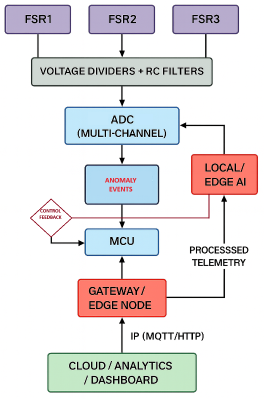 The multi-channel FSR platform delivers a complete, extensible sensing infrastructure that spans the entire pipeline from analog force acquisition to edge-level intelligence and cloud-based analytics. At its foundation, an array of force-sensitive resistors (FSR1–FSR4) converts applied pressure into proportional resistance changes ranging from about 10 MΩ at no load to roughly 200 Ω under high force with an actuation threshold of 0.2–0.5 N that enables responsive, high-resolution load detection. These nonlinear resistance profiles are conditioned through a dedicated analog front-end that employs precision voltage-divider networks, optional RC filtering, and op-amp stages to generate stable 0–Vref analog voltages for accurate digitization. A microcontroller-based data acquisition layer samples all channels through integrated or external multi-channel ADCs, performing essential preprocessing such as noise filtering, baseline correction, normalization, event detection, and multi-point pressure mapping. An optional embedded Edge-AI module augments this pipeline with lightweight anomaly-detection and pattern-recognition algorithms capable of identifying abnormal pressure signatures, sensor drift, mechanical misalignment, and early-stage failure modes in real time. The platform supports secure upstream telemetry through UART, I²C, SPI, Ethernet, Wi-Fi, or LTE gateways using protocols such as MQTT or HTTPS, enabling scalable device connectivity. At the cloud or on-premise layer, long-term analytics including calibration-drift tracking, multi-sensor correlation, behavioral trend analysis, and fleet-wide device health scoring are visualized through a configurable dashboard offering both real-time and historical insights. Overall, this architecture provides a robust, adaptable solution suitable for industrial automation, robotics, medical devices, smart manufacturing, and high-precision research environments, where accurate pressure monitoring, real-time anomaly detection, and comprehensive telemetry are mission-critical